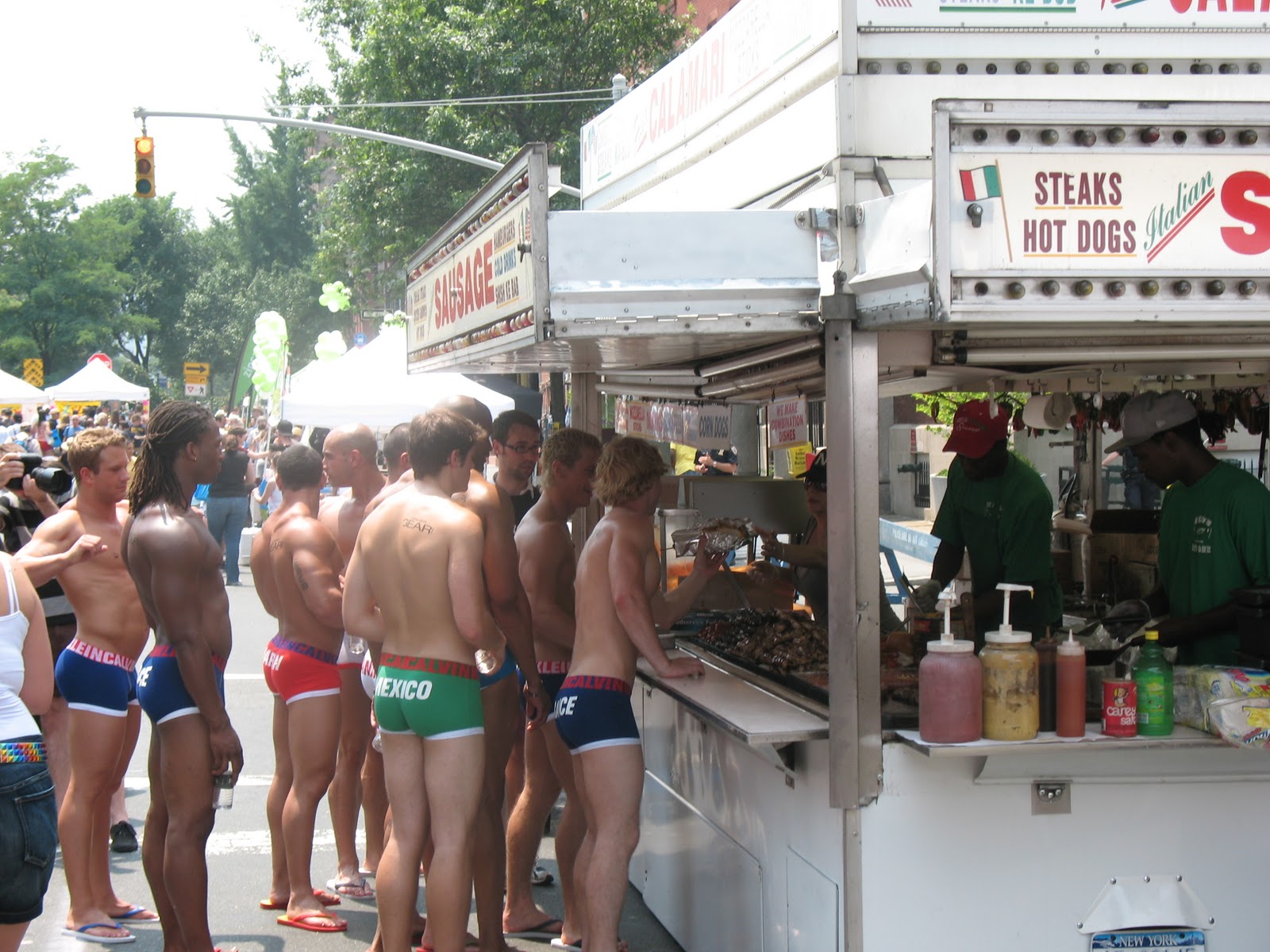 | Undergear models buying lunch at a sausage vendor. The humor is not lost. |
