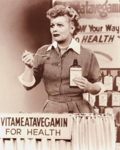When my Aunt hit a milestone birthday, my mom decided to make a tribute film to her, in the style of a Rhino records infomercial. But in this film, Lucy Ricardo would star – at least, my mother, in a navy dress with white polka dots, red wig and pearls, would star. She donned her costume, drew in her lips, and hit “play” on the boombox. Each song that blared from its tinny speakers was a march through the decades of my Aunt Judy’s life thus far and each was specifically chosen to represent each member of the family. My mom, mostly silent through the film, lip synced to the tunes and acted out scenarios associated with each song’s narrative. At one point our black lab, named Lucy for our favorite television star (we also had a Shar Pei named Ethel and yes, the two of them got into their own ridiculous adventures), nudged into view and barked at the stranger who was clowning it up in the dining room while I sat behind the gigantic camcorder and tried, failingly, to muffle my laughter. As the film went on my mother took tablespoon after tablespoon of Vitameatavegamin (ala Lucy’s classic episode). I don’t remember what she used for the Vitameatavegamin but she did pretend to get intoxicated and eventually turned the bottle up and swallowed the rest whole in a drunken stupor. It was hilarious.
