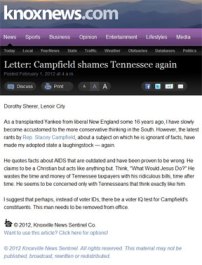 In conclusion, Campfield was NOT carried to Nashville on the shoulders of 136,000 (a majority) cheering Knox County voters and there is NO groundswell of support for this idiot among Knox County voters.
