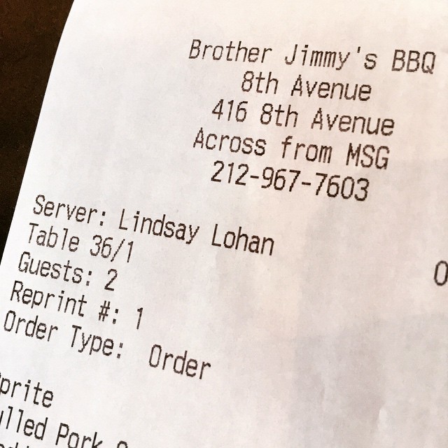 Our waitress this weekend at @BrotherJimmys… @LindsayLohan. #notthesameonebutstill #nyc #bbq #lohan