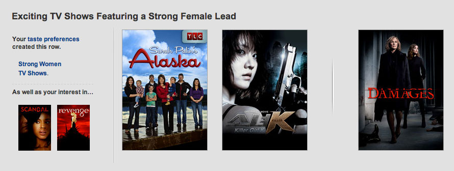 Sarah Palin’s Alaska popped up in my recommendations list under the heading “Exciting TV Shows Featuring a Strong Female Lead” because I watch Scandal and Revenge. Ok, if we are just talking titles, I get it… but “strong female lead” is a stretch. “Comically inept female lead?” Maybe.